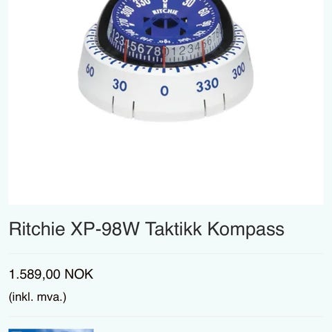 Ritchie kompass med hus i rustfritt stål. Kompasset har en svart topp med tydelige graderingsmarkeringer for navigasjon. Designet for maritim bruk, egnet for montering på båt eller lignende fartøy.