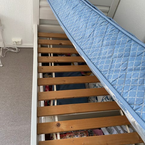 Pent brukt seng, kan trekkes ut, med to madrasser, ca 3 år gammel. Skuffer under seng. Madrassbeskyttelsene er nyvasket.