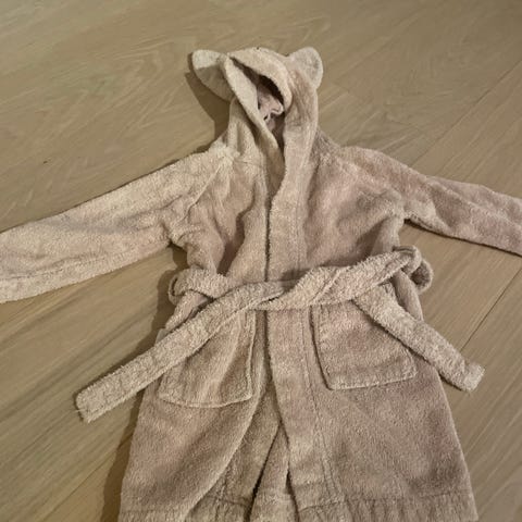 Liewood badekåpe i beige farge, laget av bomull. Passer barn i størrelse 3-4 år og er unisex. Badekåpen har hette med dekorative elementer.