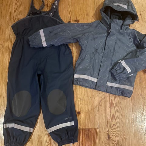 Regntøy med fleecefor str 110. Jakken er ubrukt med lapp og buksen er brukt kanskje 2-3 ganger. Noen sandflekker på buksen og et lite merke, se bilder. Kan sende☔️