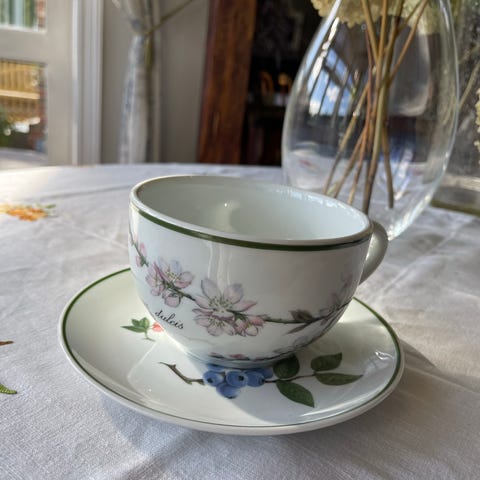 Selger et samlet sett med Apilco Elysian Gardens porselen, produsert i Frankrike. Mønsteret er utgått og ettertraktet blant samlere.