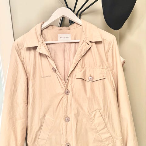 Jakken er beige med dunfyll, fin vinterjakke eller overgangsjakke vår/høst