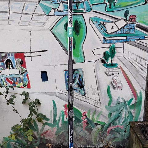 Landsem langrennsski med en lengde på 210 cm. Skiene har tradisjonelle bindinger og en fargekombinasjon av hvit, rød og blå. Egnet for bruk på preparerte skiløyper.