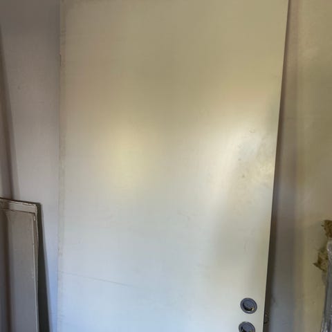 hvit dør, dørblad er 82,5 bred og 204 cm høy. karm er 212 cm høy