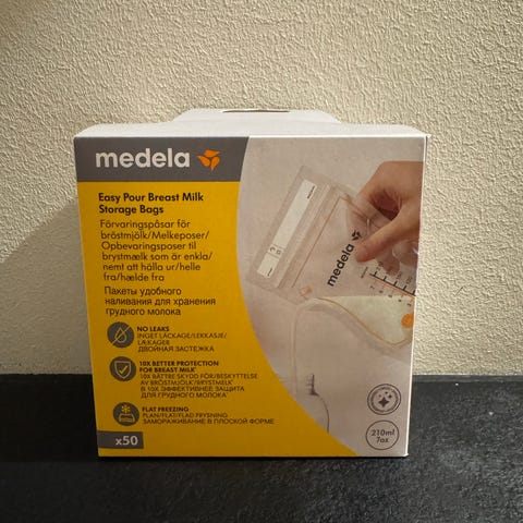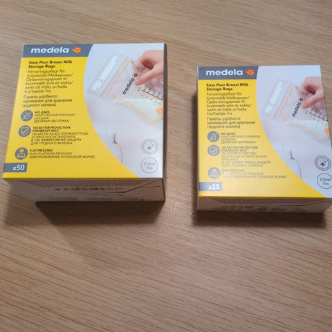 Esken er åpnet, inneholder 20 stk. Følger med 2 stk fra medela