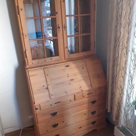 Koselig framskap med glassdører og oppheng for vinglass. Laget i furu med 3 store skuffer og 2 små. 3 skapdører med innvendige hyller. Utskjæringer i toppen. Ikke altfor stort framskap som passer perfekt på hytta eller gården. Kan deles for enklere frakt. Må hentes her.
