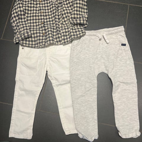 Tre pent brukte og to godt brukte bukser til gutt i bomull. 4 av dem er joggebukser, den beige har flekker på knærne som ikke har gått bort i vask, men den er lite brukt.