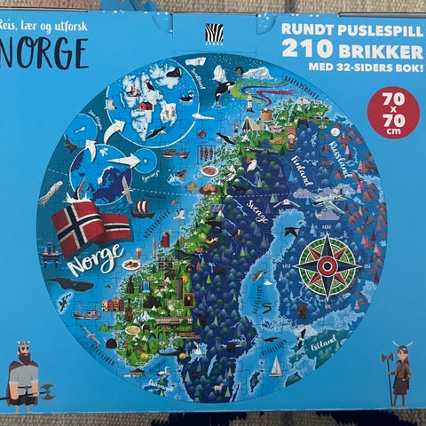 Rundt puslespill med 210 brikker og en bok med 32 sider. Puslespillet har et motiv som viser kart over Norge med illustrasjoner av landemerker, dyr og kultur. Passer for barn fra 7 år og oppover.