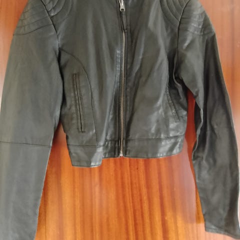 Pen jakke i svart fuskeskinn, størrelse M. Jakken har fuskeskinnsmateriale med en foret innside som gir ekstra varme.