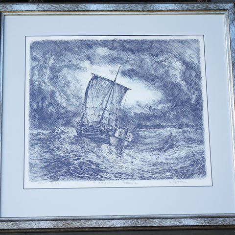 Signert kunsttrykk i svart-hvitt som viser et detaljert motiv av et vikingskip. Bildet er innrammet med en enkel, lys ramme.