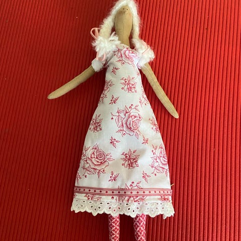 Håndlaget Maileg maxi musedukke med beige kropp, iført rød kjole og rød lue. Dukken har lange ben og armer, og er laget i stoffmaterialer. Passer som dekorasjon eller leketøy. 60 cm.