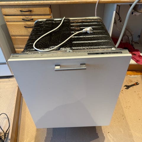 Asko Annet oppvaskmaskin med hvit front. Passer for integrert kjøkkeninstallasjon. Enkel betjening med to kontrollhjul på fronten. Designet for effektiv oppvask i hjemmet.