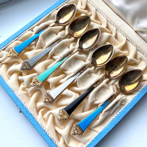 Selger et vakkert sett med 12 moccaskjeer i 925 sølv med emaljedekor. Klassisk norsk design, svært populære blant samlere og til bruk ved kaffebordet.