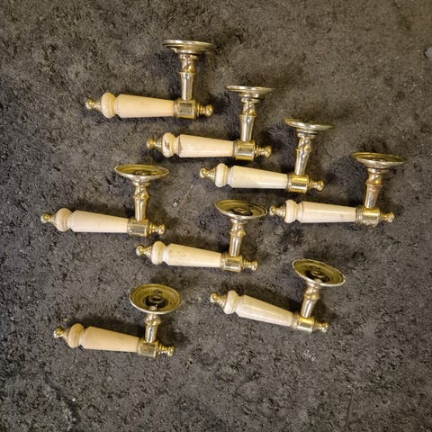 9 stk. Messing dørhåndtak i vintage stil. Passer til standard dører. Produktet er uåpnet og kommer i original emballasje. Leveres med skruer for montering.