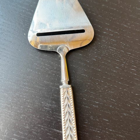 -1 kakespade,6 kake gafel,8 små kake skjeer,6 kniver og 6 gafler.Totalt 25 deler.Ny pris 34 tusen ca