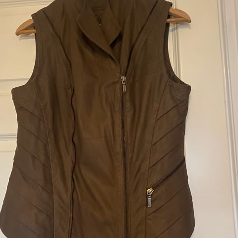 Lang, pen, grå skinnvest, semsket, med kanting i sauepels. Skjulte hekter i front om man vil ha den lukket.
