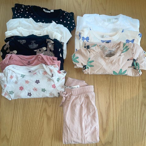 Klespakke i str 86. 1 snekkerbukse, 1 pysj, 2 heldresser, 3 bodyer, et sett