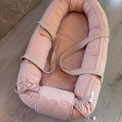 Babynest med polka dot mønster i rosa. Laget for å gi en trygg og komfortabel soveplass for baby. Passer for nyfødte og små babyer. Ingen flekker eller anmerkninger. Trekket kan tas av og vaskes. Den ser litt beige ut på bildene, men er eb fin lys rosa