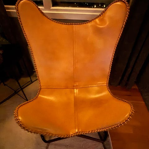 Butterfly stol med skinntrekk i svart-hvit. Stolen har en sammenleggbar ramme i metall og et trekk som dekker setet og ryggen. Passer til innendørs og utendørs bruk. Ekte kuskinn. Veldig kule. 500kr per styk.