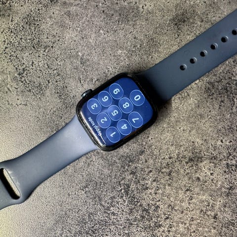 Apple Watch Series 6 smartklokke med rød reim. Enheten viser batteristatus og har en maksimal batterikapasitet på 87 %.