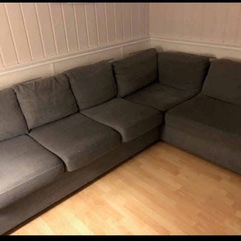 Siste sjanse. Er i 3 deler nå. Hjørnesofa som består av en 2 seter, ett hjørne og en hel del. Trekk på ryggputer kan tas av, men sitteputene er fast i sofaen. Den har noe nedsig på 2-seteren og på den hele delen, men kan fortsatt gjøre nytte for seg. Den har ett godt hjørne og siden man kan ta vekk putene, så kan den også fungere som en gjesteseng. Den er 2.70 ×2.50, så det er en relativt stor sofa. Sittedybde er 75 og høyde opp til sitteputene er ca 40 cm.. Renset ca 1 gang pr år.