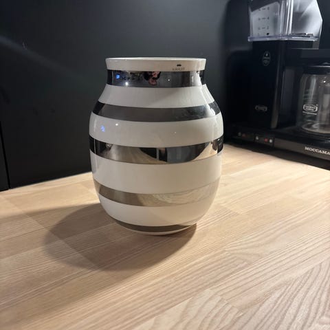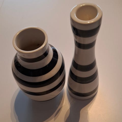 Kähler vase med et sort og hvitt stripet mønster. Laget i keramikk, egnet som dekorativ gjenstand for blomster eller som interiørdetalj.