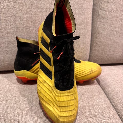 Adidas Predator fotballsko i størrelse 44,5. Skoene har svart og rødt fargedesign og er egnet for bruk på gressbaner og kunstgressbaner. Laget med materialer som gir godt grep og støtte under fotballspill. Brukt kort periode.