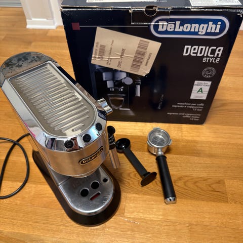 Ny pris! DeLonghi Magnifica S espresso/kaffemaskin i svart. Integrert kvern og manuell melkeskummer. Kjøpt brukt for fire år siden. Følger med en DeLonghi kaffemaskinrens!