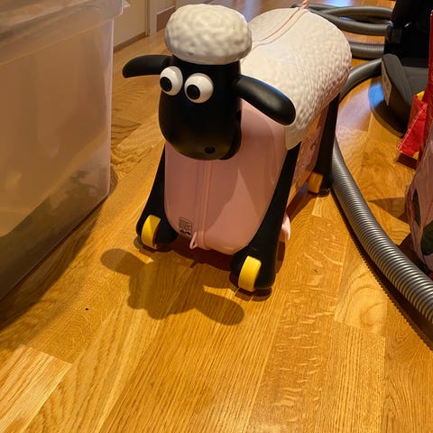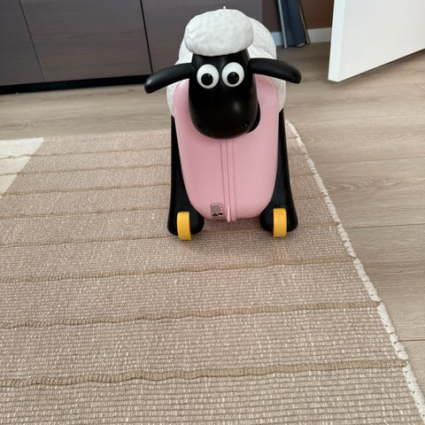 Reisekoffert til barn a la trunki med Sauen Shaun. Kjempesøt og morsom. Åpning av koffert med tungen og halen.
