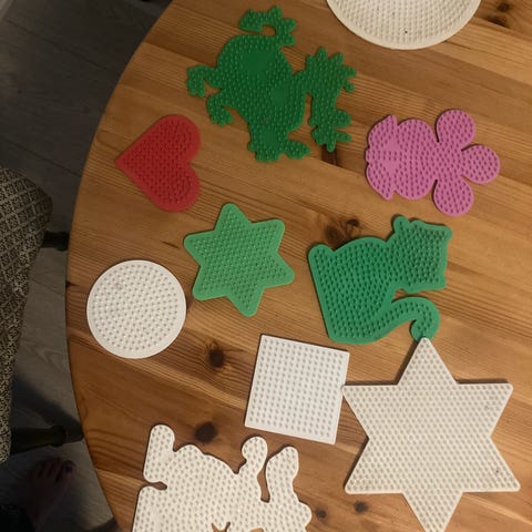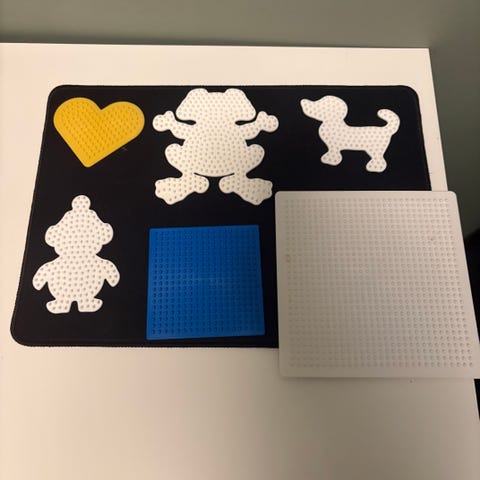 Hama perleplater i ulike figurer som sirkel, hjerte, stjerne, kanin, bil, hest, bamse, bjørn og hund. Medfølgende fargede perler til bruk på platene. Egnet for kreativ hobbyaktivitet og perlekunst.