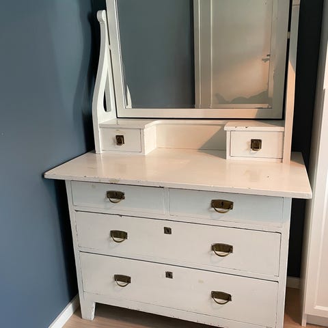 Kommoden er solid, skuffene er ok men to av dem mangler beslag og håndbøyle.