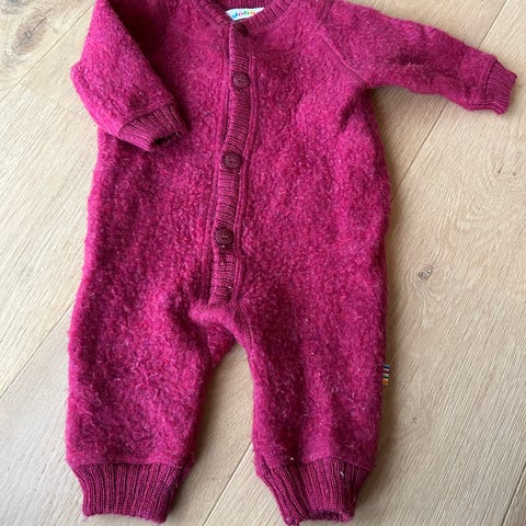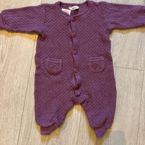 Ubrukt ulldress i myk, kløfri merinoull. En one-piece baby vil få det behagelig med både under soving, lek og kos. Brettekant nederst i føttene som kan brettes over tærne; dette er en ulldress både med og uten føtter. Alt etter ønske og behov. Er stor i størrelsen så passer 56-68. Kun vasket.