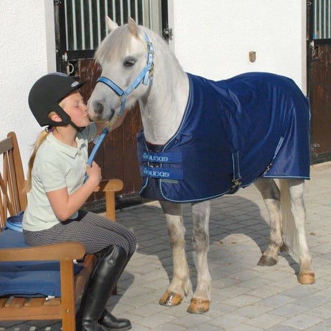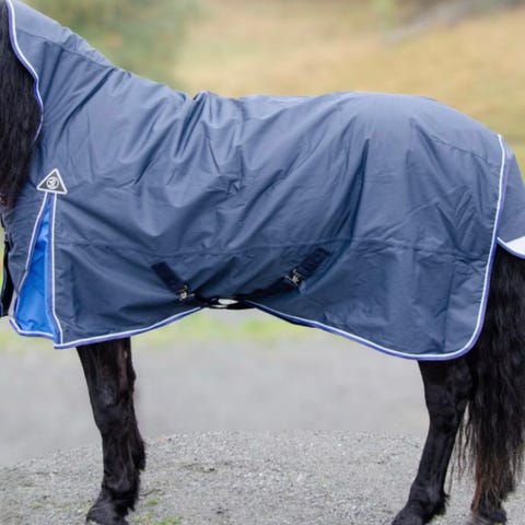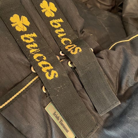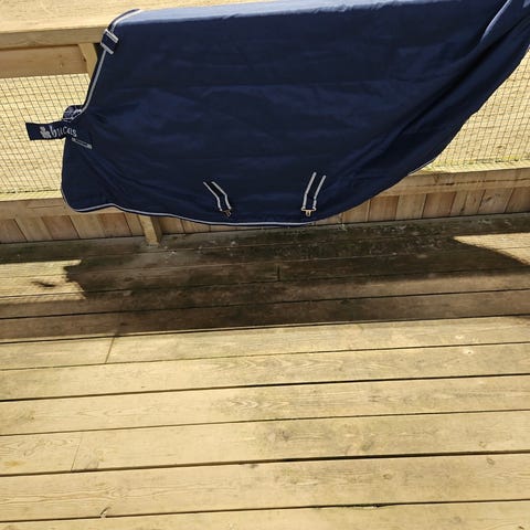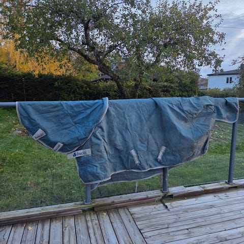 Gammelt, men helt Bucas-dekken med fast hals og fast bogforlenger. Størrelse og gram er slitt bort fra lappen, men det er litt snaut til en litt rund kaldblods som bruker 145 til vanlig.