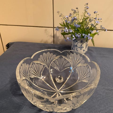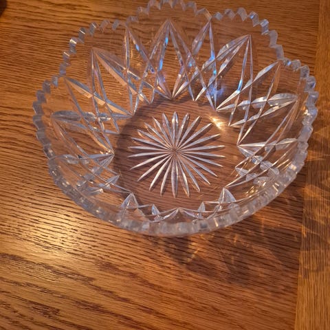Krystallbolle vekt 1.7 kg. Diameter 15 cm, høyde 7 cm. 2 små skår, nesten ikke synlig.
