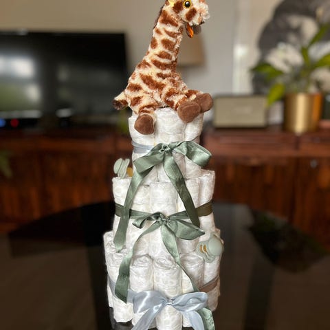 Bleiekake med blå sløyfer - strl 1 og 2 i bleier. Fint utgangspunkt for å pynte den videre selv med andre gaver. (Det er den som er på bildet som selges og den er ferdiglaget 07.01.26)