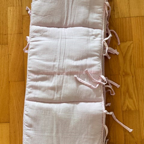 Hvit sengekant. Selve sengekanten er kjøpt men jeg har sydd blonde på begge sider selv. Er ca 335 cm lang, 28 cm bredd og ca 1.5- 2 cm tykk. Kan sendes elker hentes ved Solli i Oslo