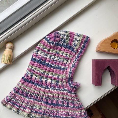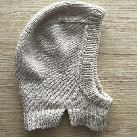 Hjemmestrikket balaclava som er lite og pent brukt. Veldig god passform og lang brukstid. Strikket i Double Sunday.