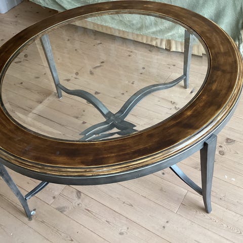 Mørkebrunt, rundt sofabord med spiler selges. Bordet er kjøpt på Fagmøbler og brukt i 2 år. Et lite merke i bordet (som vises på bilde) men ikke noe man tenker på. Bordet er i mørkbeiset eikefinér og «moccafaget» treolje følger med😊