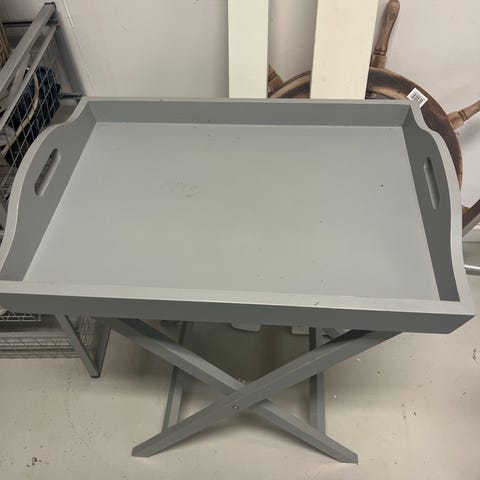 Jysk bord i svart metall med avtagbar topp, egnet som sidebord eller serveringsbord. Bordet har et rundt brett og sammenleggbare ben for enkel oppbevaring og transport.