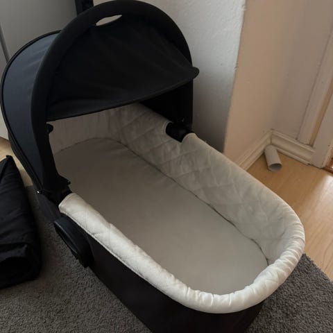 Baby Jogger barnevogn med svart farge. Inkluderer regntrekk og . Egnet for bruk med barn, designet for praktisk og komfortabel transport. Ligge delen framstår som ny med tilbehør, selvevogn staviet et syndelig brukt med litt rust på metalet.