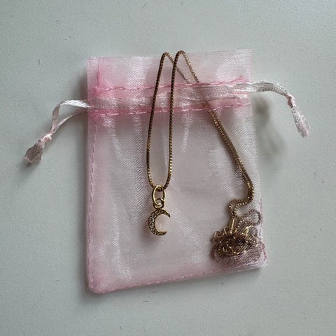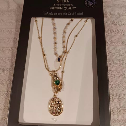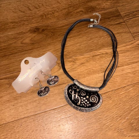 Settet inkluderer øredobber og halskjede med hjerteformede detaljer.