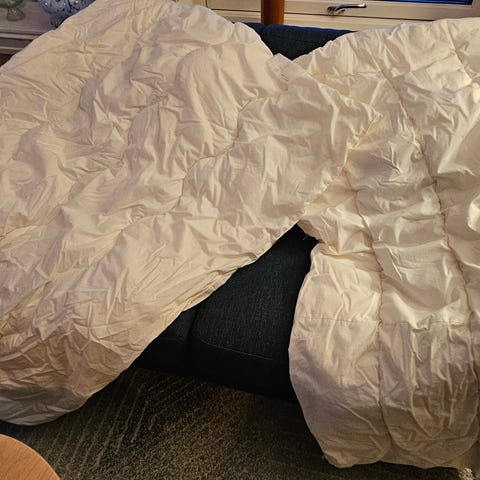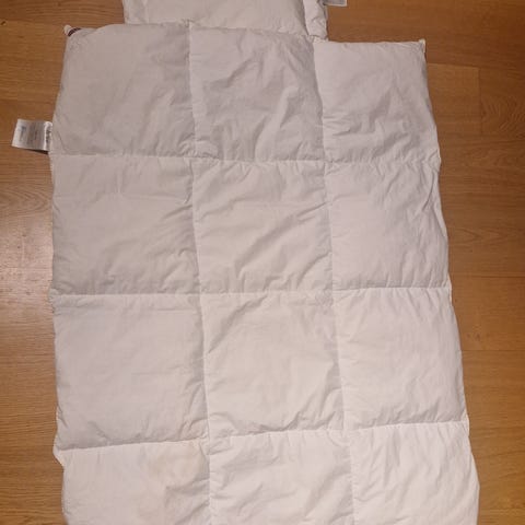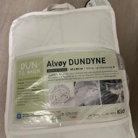 Usynlig brukt av dune dyne (65x80cm) og uåpnet pute Alvøy. Og 5 sengesetter er med (2 av dem er ubrukt)