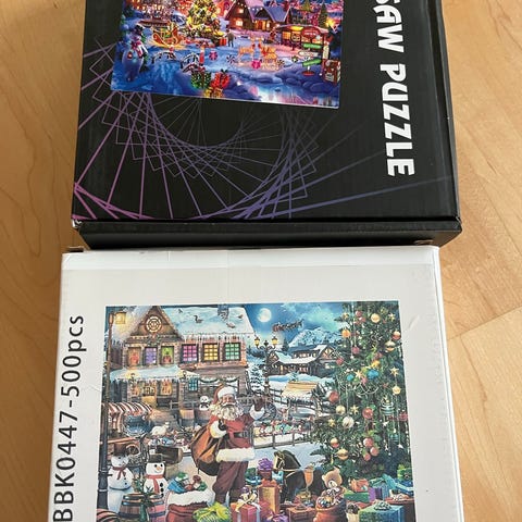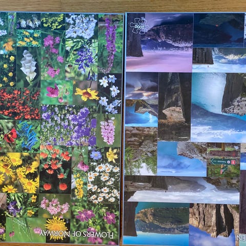 To puslespill med motiver av norske landskap og bybilder. Puslespillene har fargerike og detaljerte illustrasjoner som viser kjente steder og natur. Egnet for hobbybruk og som dekorasjon.