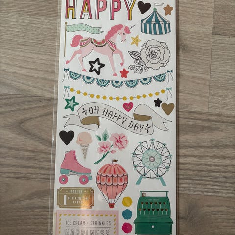 Liten scrappepakke med stempler, klippeark (både klipp og stanset ut med dies), klistremerker fra Reprint