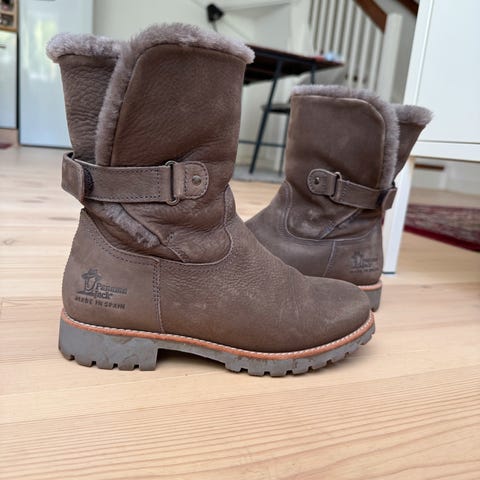 Overmaterialet er i lær, lammeskinnsfor, brukt kun en gang. Som nye. Skoene er kjøpt for små, dessverre.