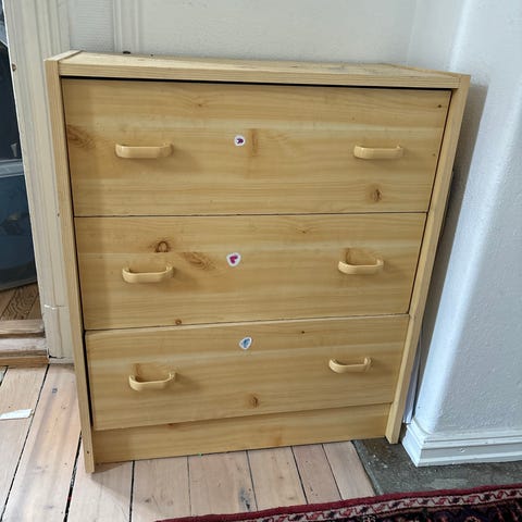 Godt brukt, er noen merker på den. Gis bort som den er. Ellers så fungerer skuffene å alt som den skal.
