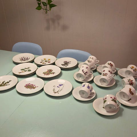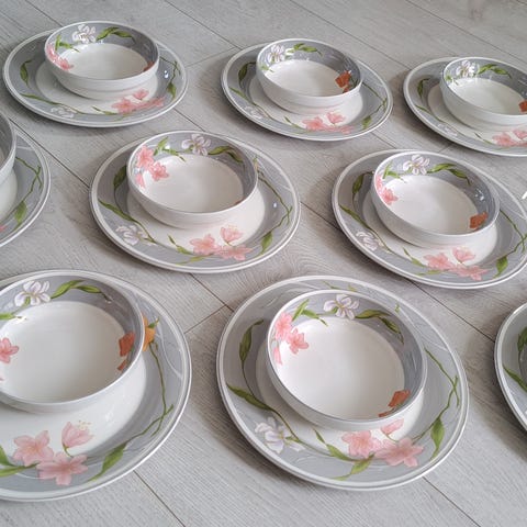 Pent brukt middagsservise fra Sango, Belle Fleur. « Country French». Seks middagstallerker, en serveringsskål, et serveringsfat og to sausenebb. Selges samlet. Et krakelert fat og en krakelert selveringsskål kan fås med om ønskelig. Serveringsfatet har et lite merke under, som ikke kan sees på oppsiden. Bittelitt bruksmerker på noen av middagstallerkene. Ellers blank og fin i glasuren og ingen nag, Sender ikke dette, så det må hentes.