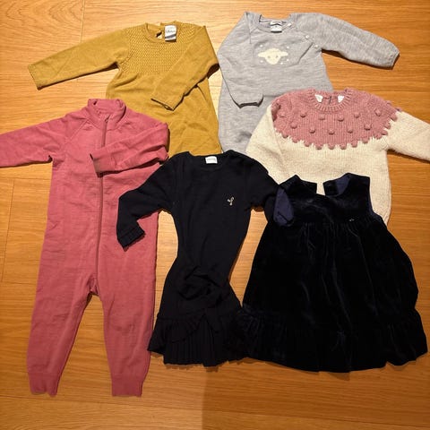 Barneklær for jente i størrelse 86 med flerfarget design. Inkluderer ulike plagg som bukser, pysjamaser og bodyer. Merker som Hust and Claire, Name it og Lindex.