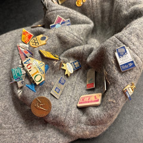 Samling bestående av ulike pins og merker i forskjellige størrelser, farger og design. Egnet for samlere eller som dekorative elementer på klær og tilbehør.