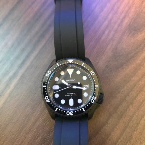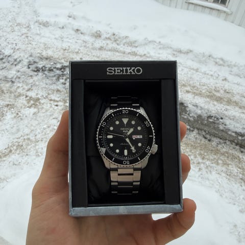 Meget pen Seiko 5 Sports automatisk klokke med pålitelig 4R36-verk. Klassisk dykkerdesign med blå bezel og dag/dato-visning. Går fint og holder tiden godt. Leveres med sort gummirem (aftermarket).